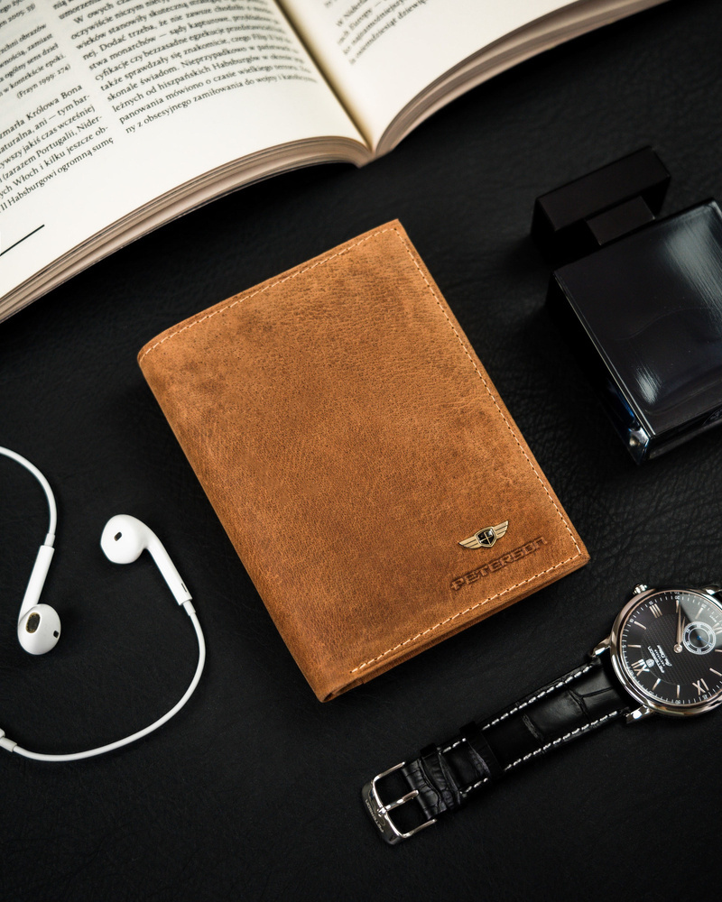 Portfel wykonany jest ze starannie wyselekcjonowanej skóry naturalnej nubukowej, garbowanej niezmienną od dziesięcioleci techniką.