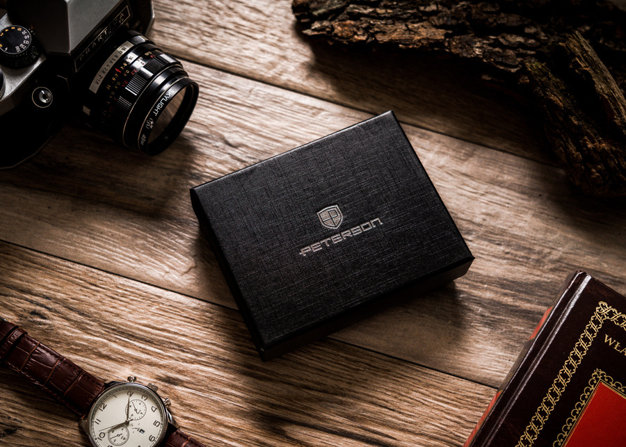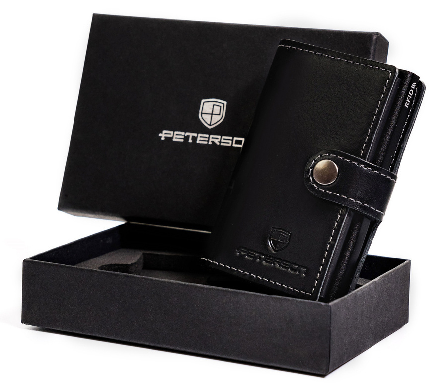 Portfel polskiej marki PETERSON® wykonany z eleganckiej, czarnej skóry naturalnej wysokiej jakości. Posiada zapięcie zewnętrzne w postaci klamry na zatrzask. Na froncie wytłoczone zostało logo marki.