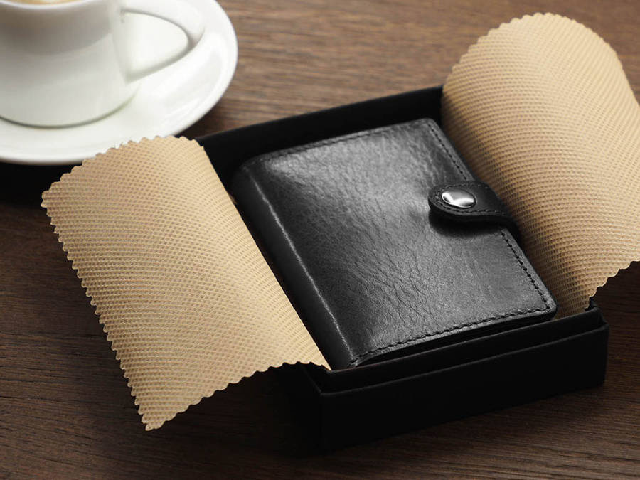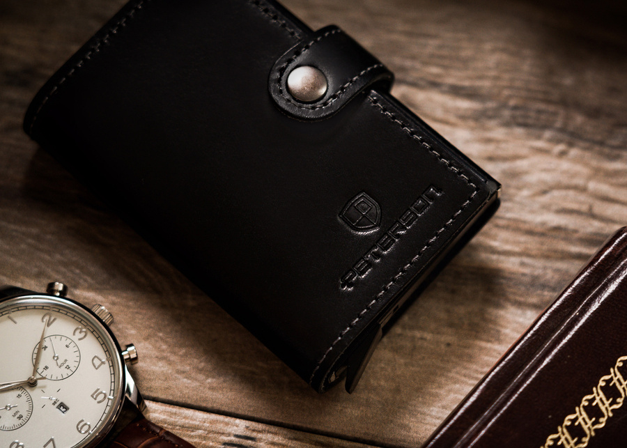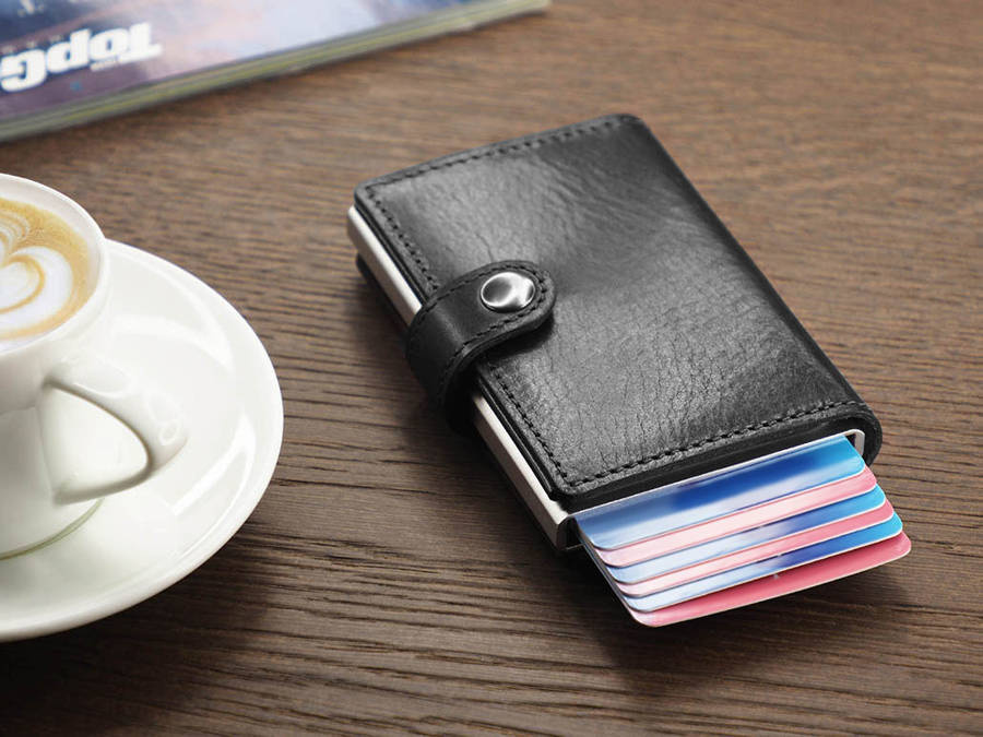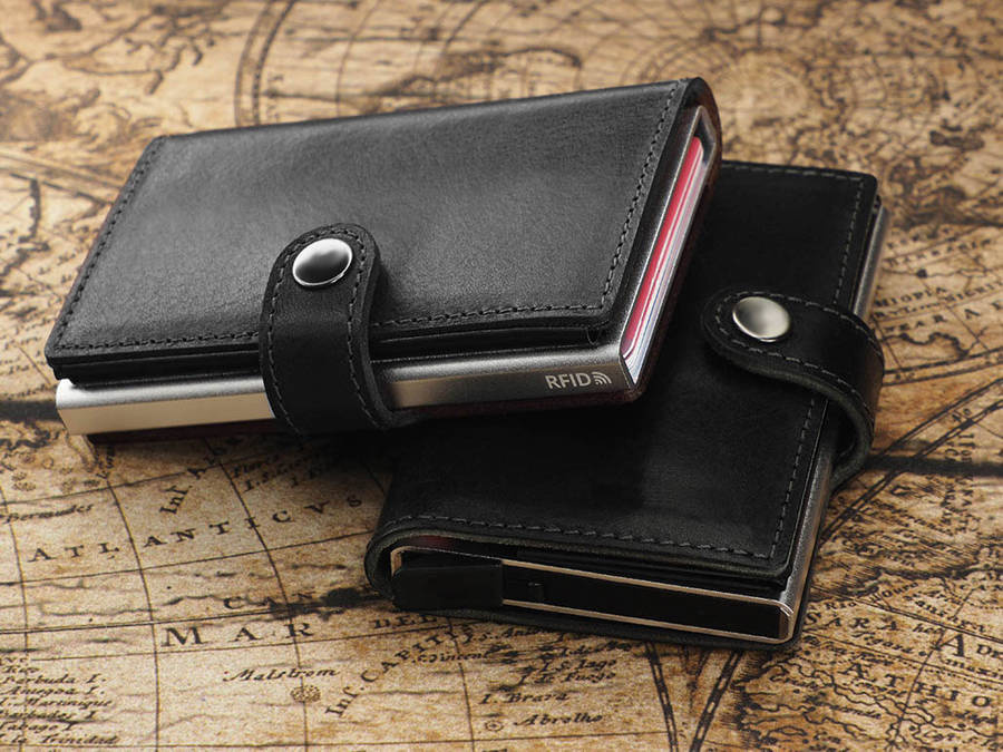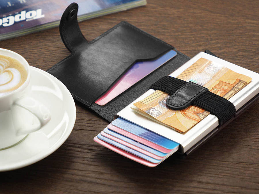 Portfel wyposażony w ochronne etui na karty z inteligentnym systemem do ich łatwego wysuwania – wystarczy pociągnąć za małą dźwigienkę, a karty natychmiast się wysuną. Wykonano je z aluminium, chroni karty przed zgięciem, łamaniem oraz niechcianymi transakcjami zbliżeniowymi