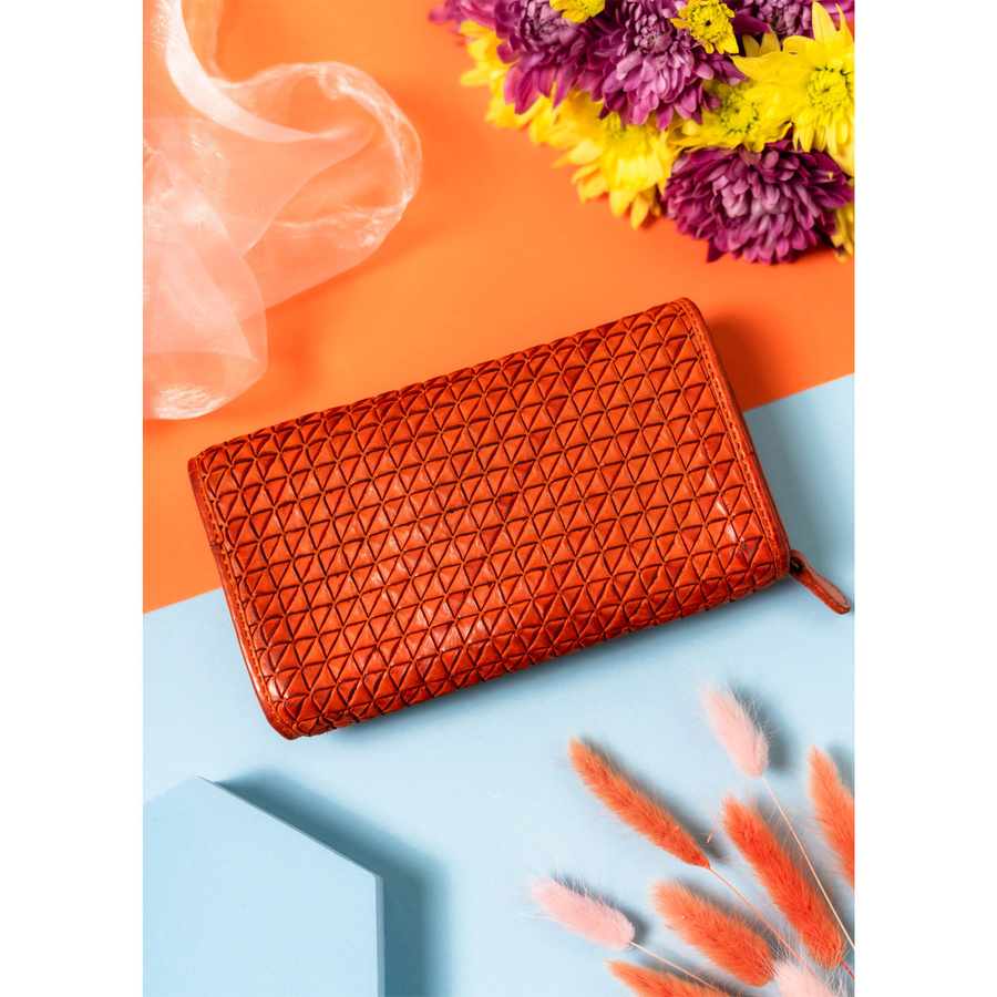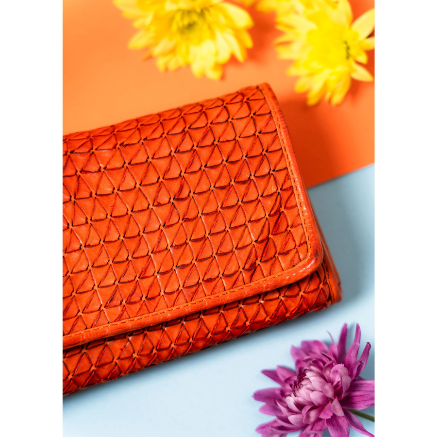 - Jego unikalny charakter podkreślają precyzyjnie przeplecione paski ze skóry na powierzchni, tworzące efekt trójwymiarowej tekstury w geometryczny wzór. Wypukłe kształty dodają elegancji i wyróżniają produkt na tle innych akcesoriów.