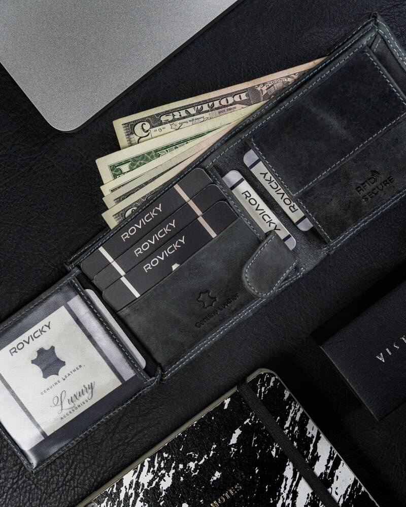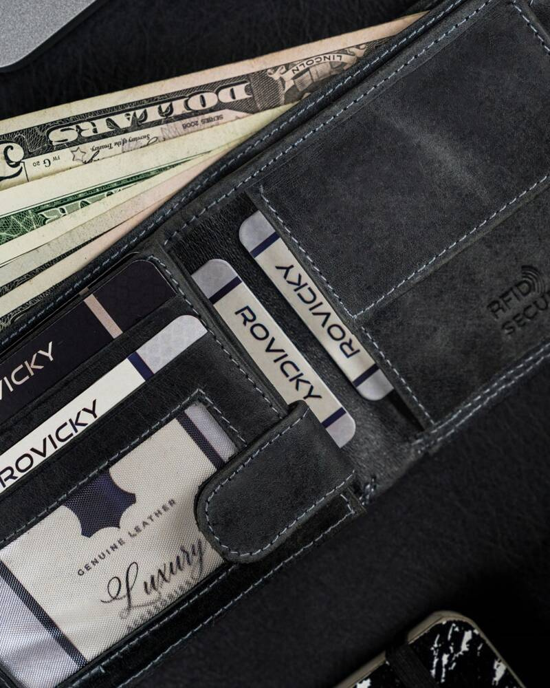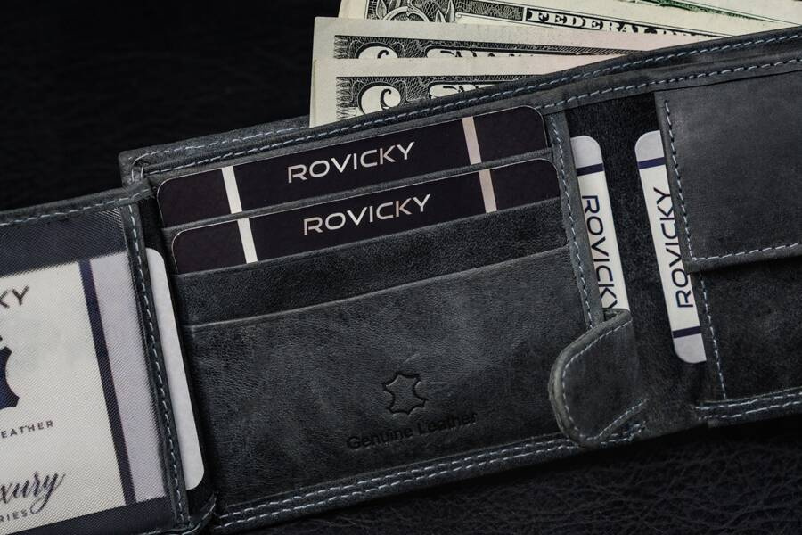 - Bezpieczny – wyposażony w technologie RFID, która chroni portfel przed złodziejami używającymi czytniku do kart;