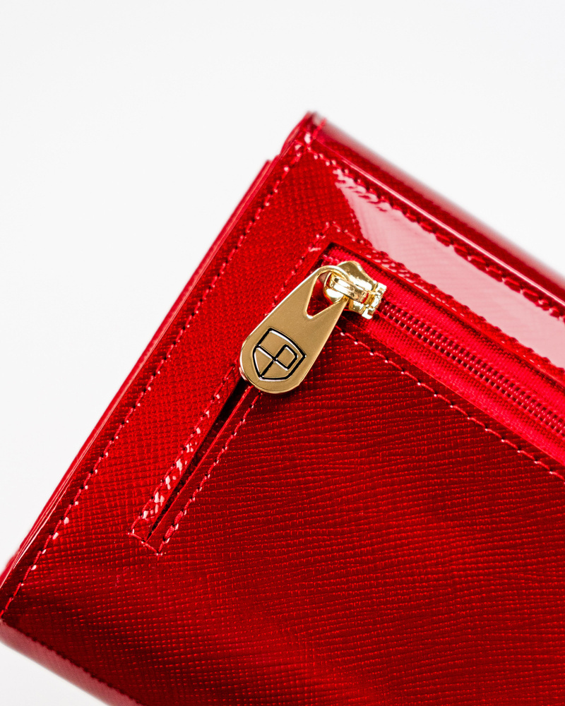 • Najwyższa jakość materiałów | Środek portfela jest uszyty z czerwonej matowej skóry, natomiast na zewnątrz znajduje się lakierowana czerwona skóra saffiano;