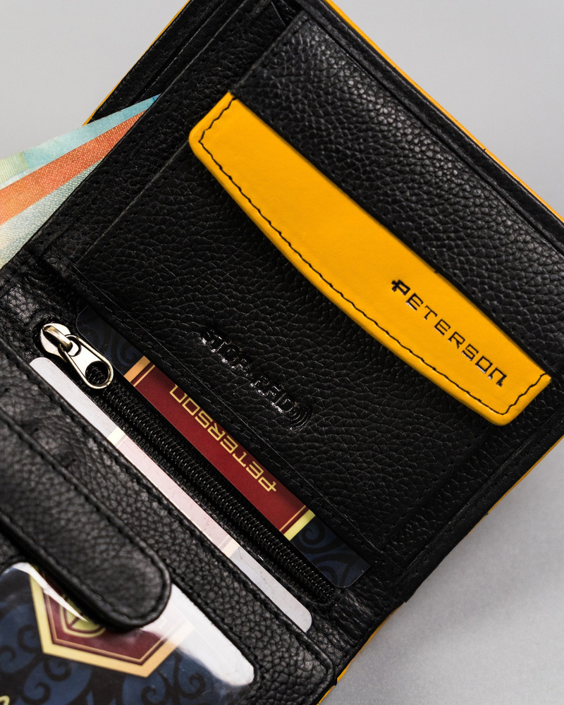 - banknoty schowasz do aż 3 szerokich przegródek, jedna z nich zapinana jest na suwak, pozostałe dwie są otwarte.