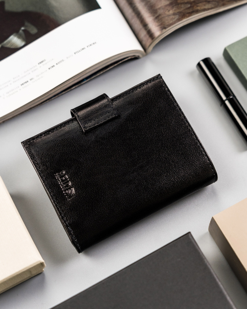 - Klasyczny fason | Portfel o ponadczasowej stylistyce. Model w orientacji poziomej zapinany na trwałe i solidne zatrzaski;