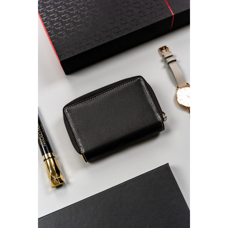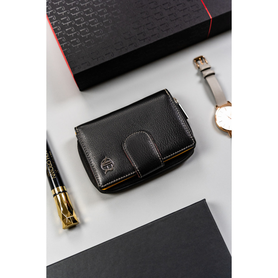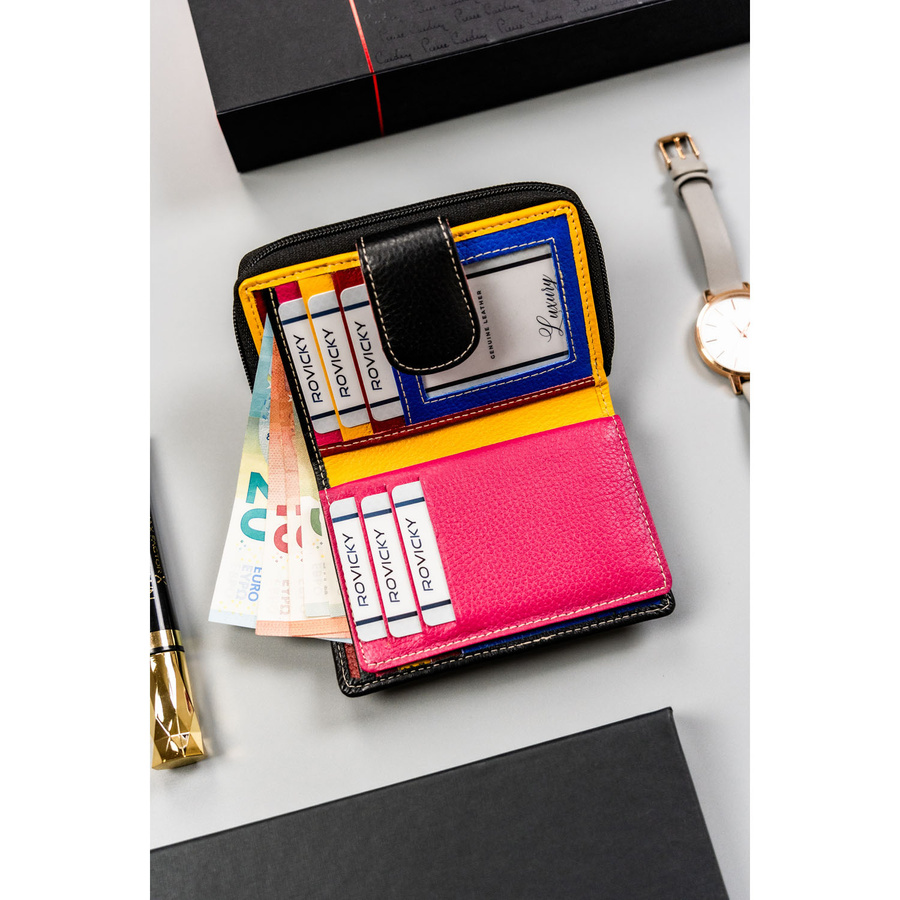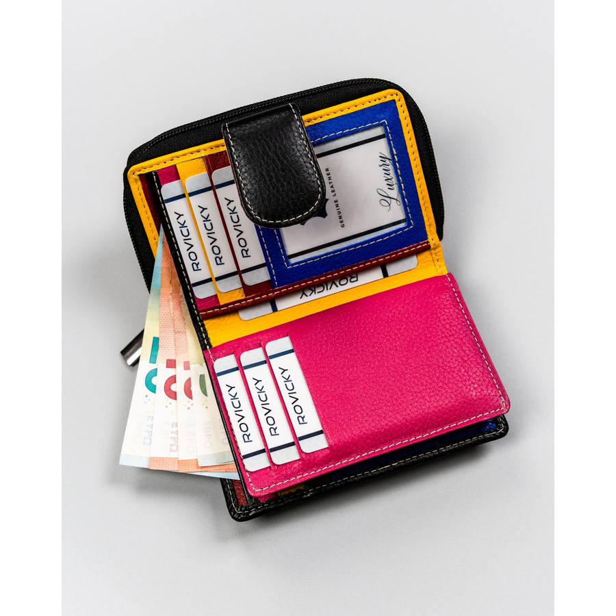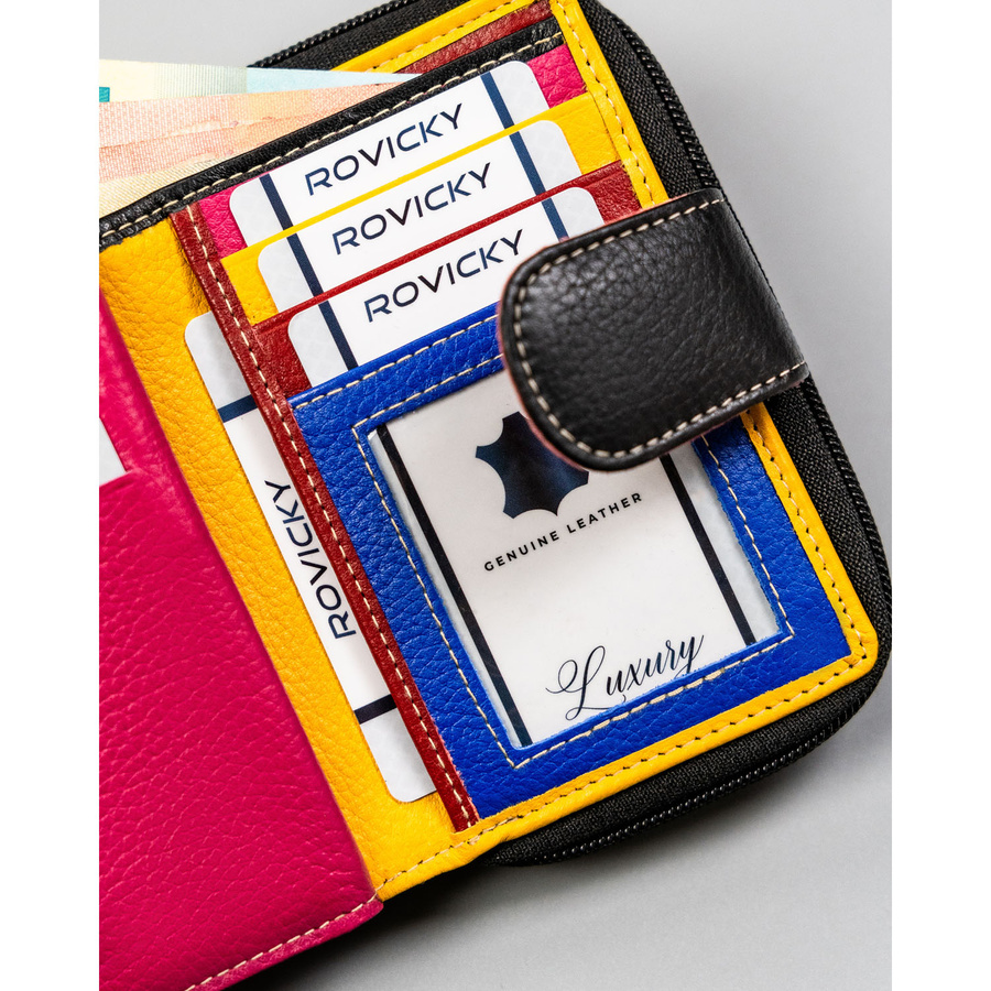 Stylowy, czarny, skórzany portfel damski na zatrzask i suwak – Rovicky