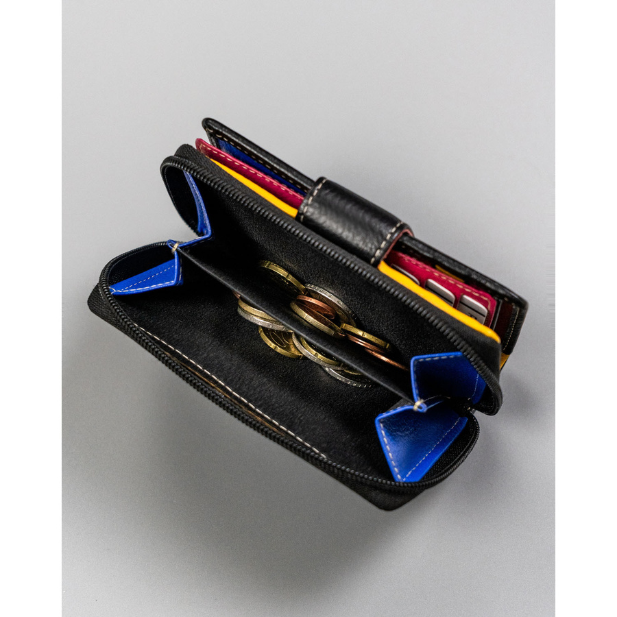 - W portfelu znajduje się duża, podwójna kieszeń na monety, zamykana na zamek błyskawiczny;