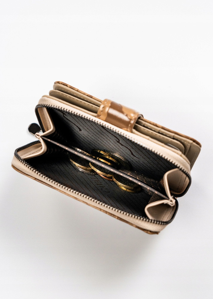 Wnętrze tego modelu jest niezwykle funkcjonalne, pomieści dużą ilość kart, dokumentów, banknotów i bilonu.