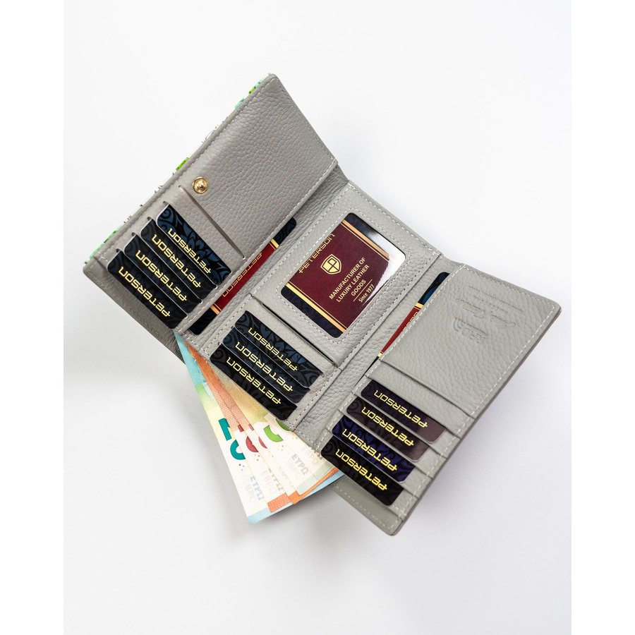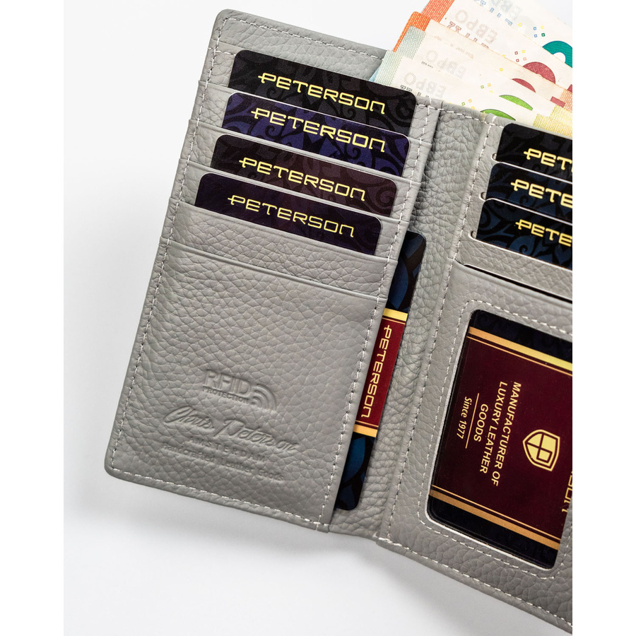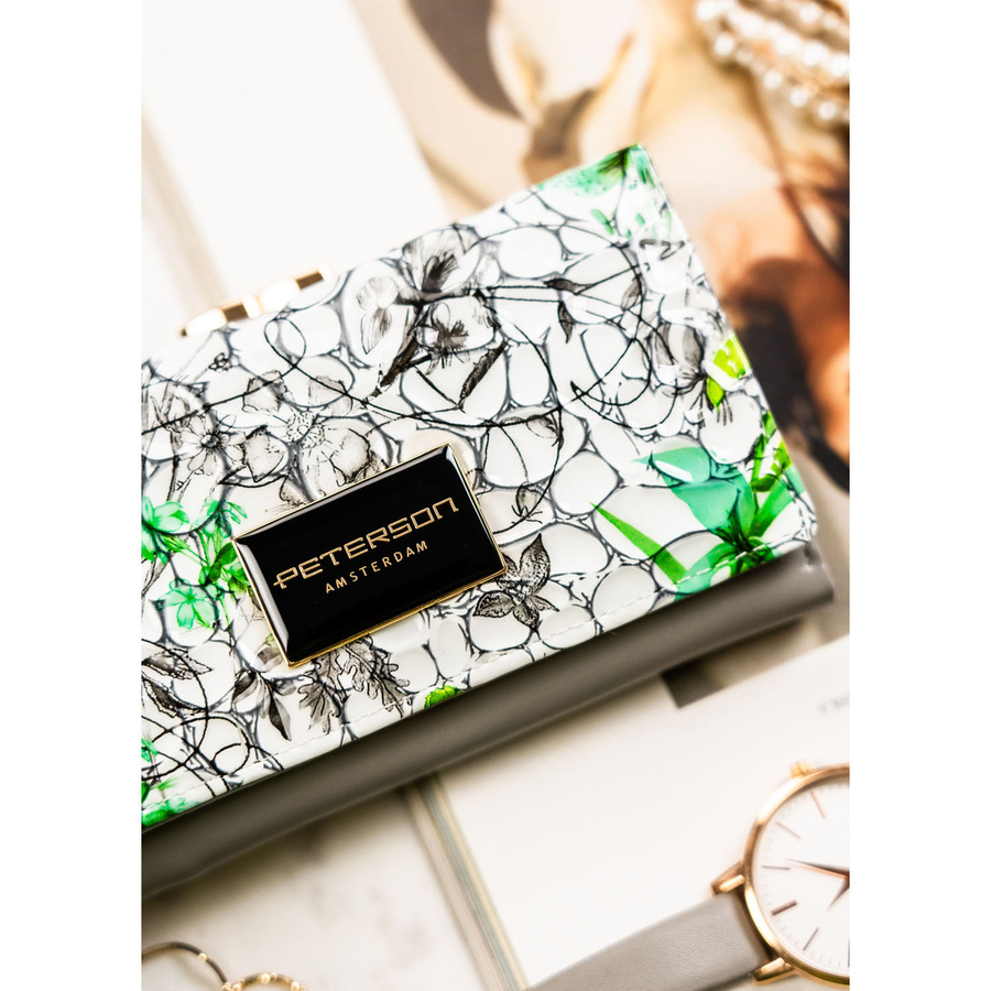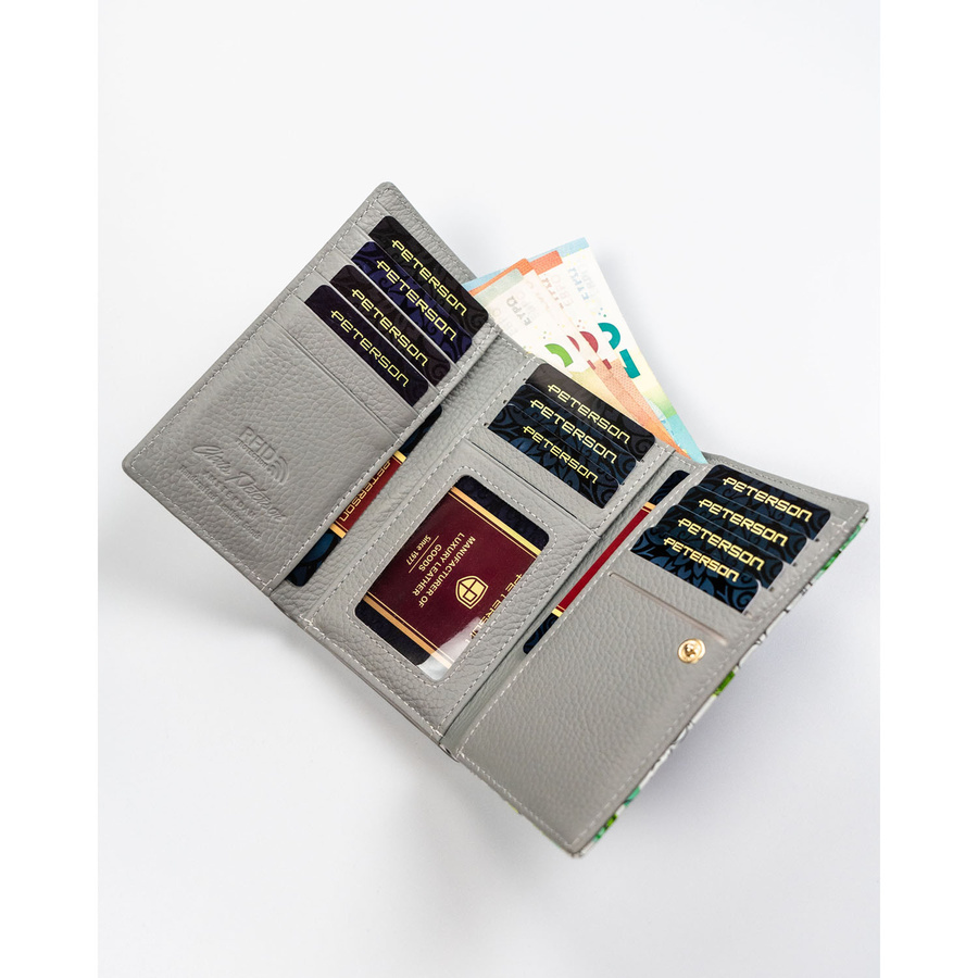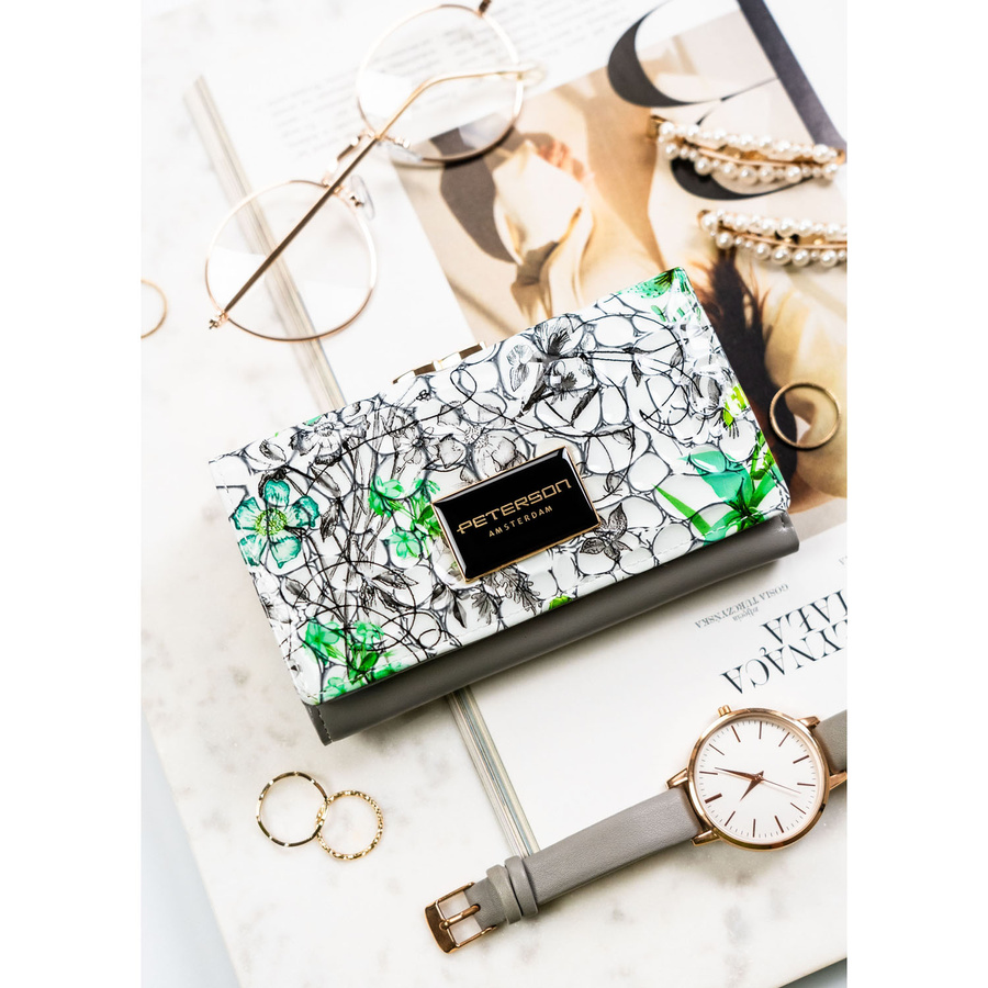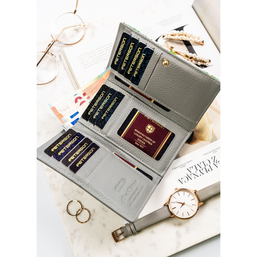 Stylowy, wielokolorowy portfel damski ze skóry naturalnej zamykany biglem i zatrzaskiem, wyposażony w system RFID – Peterson