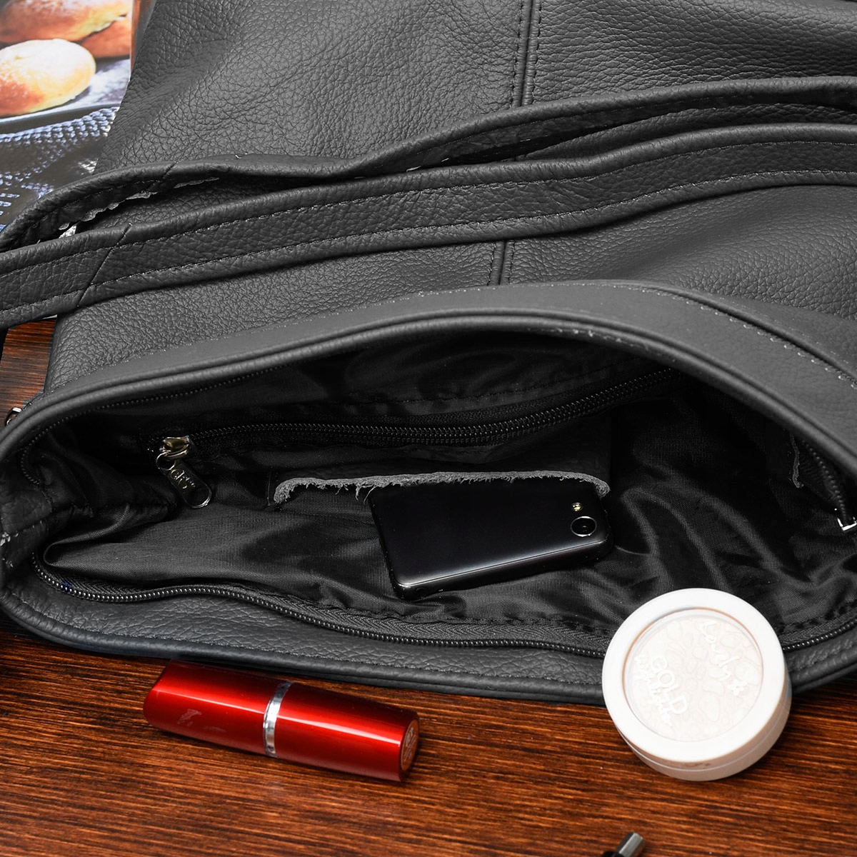 - Kieszenie wewnętrzne: – 2 boczne na telefon, klucze i inne drobiazgi: 1 otwarta i 1 zasuwana;