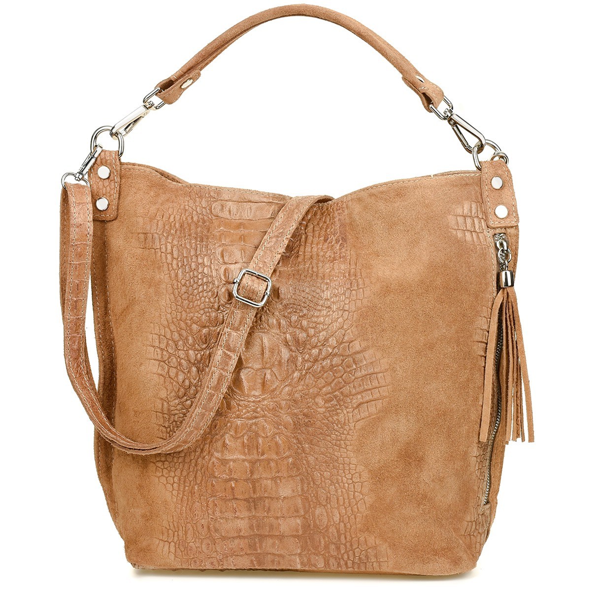 - Modną ozdobę stanowi również długi, zamszowy frędzel, będący brelokiem bocznej kieszonki torby