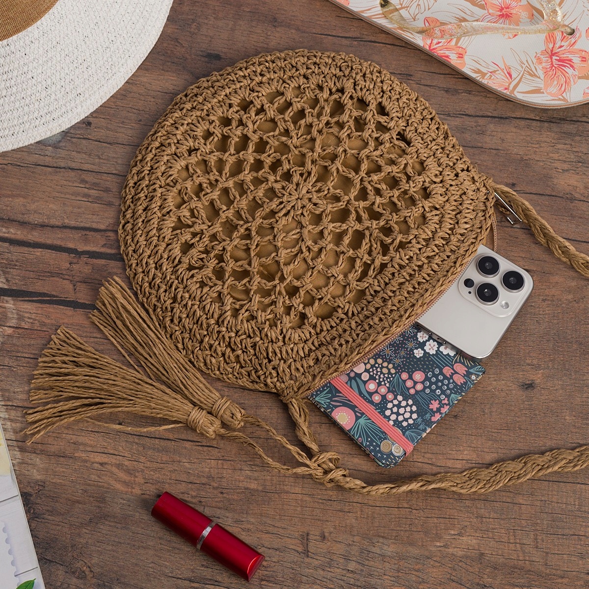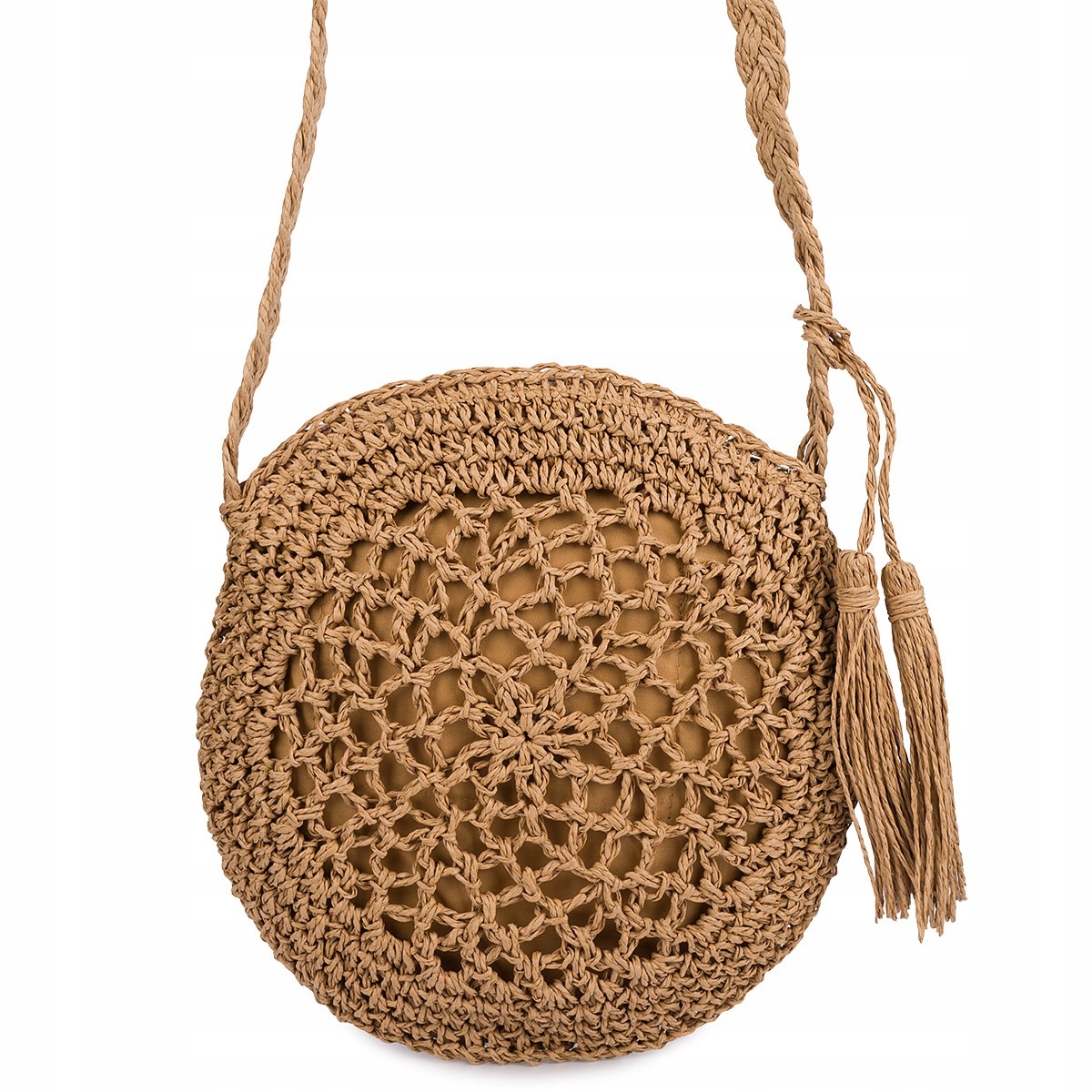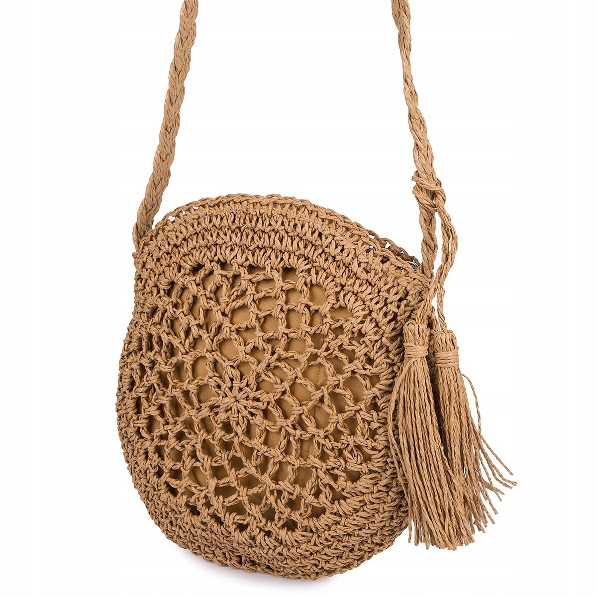 Modna torebka damska na ramię listonoszka z frędzlem w boho stylu okrągła