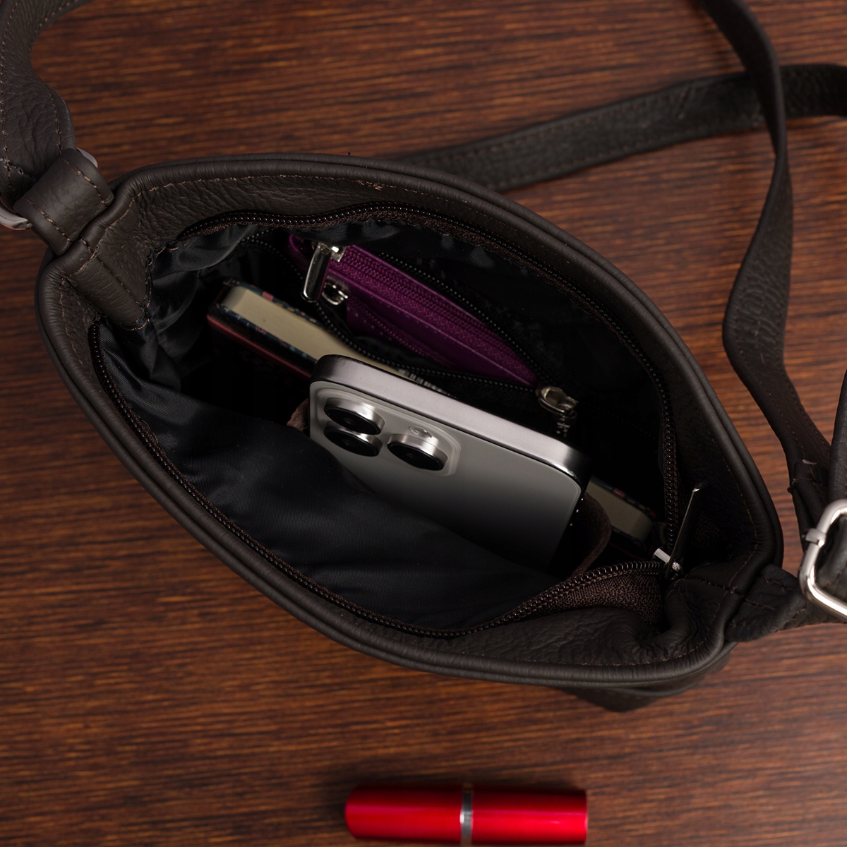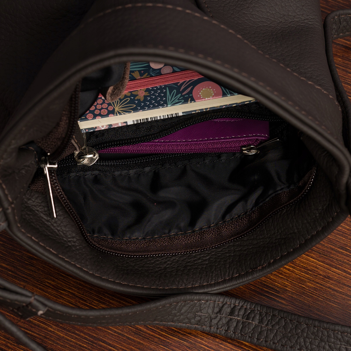 2️⃣ Po obu stronach torebki w środku łącznie 3 dodatkowe kieszonki, z czego jedna jest zasuwana