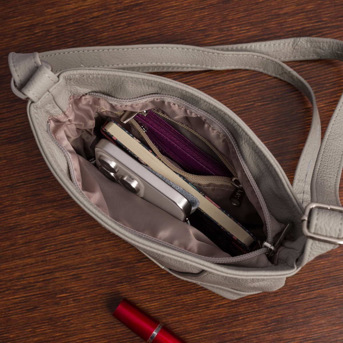 2️⃣ Po obu stronach torebki w środku łącznie 3 dodatkowe kieszonki, z czego jedna jest zasuwana