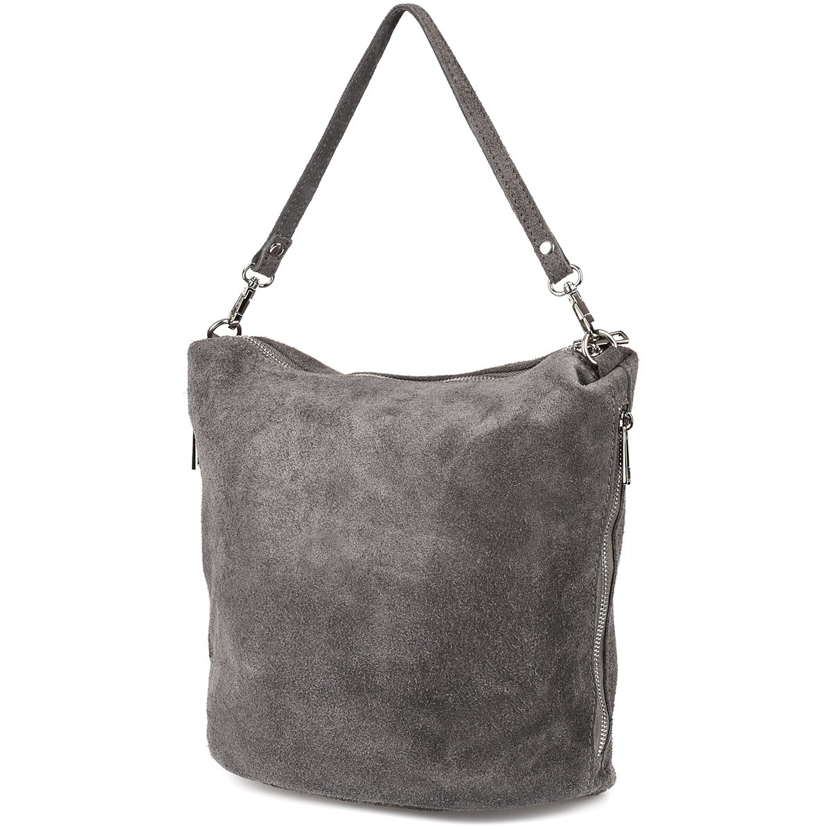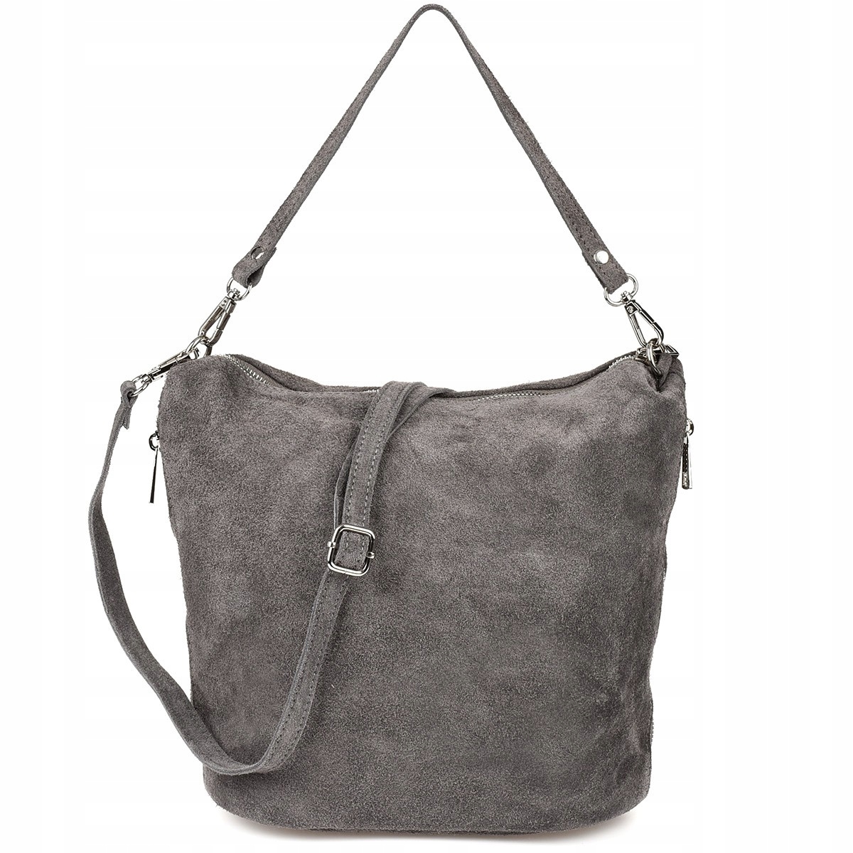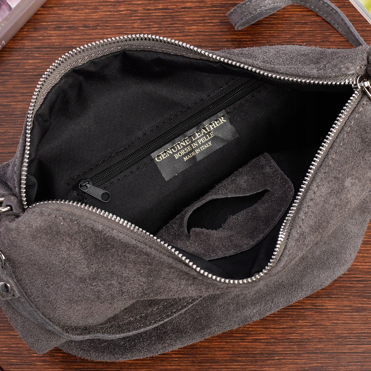 Nowa, skórzana, pojemna, damska listonoszka zamszowa, z bocznymi kieszonkami, idealna na co dzień, produkowana we Włoszech z wysokogatunkowej skóry naturalnej.