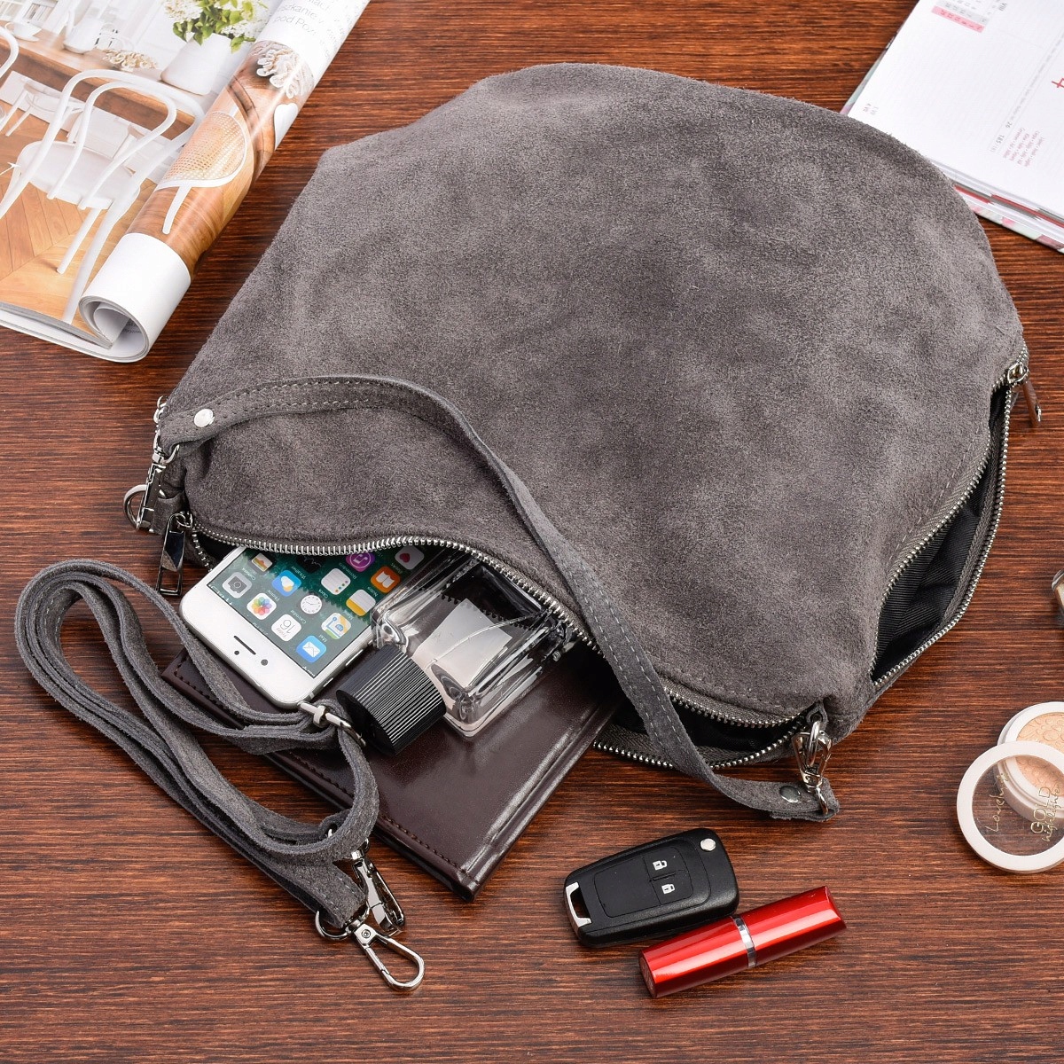 Torebka Listonoszka Skórzana Zamsz pasek suwaki
