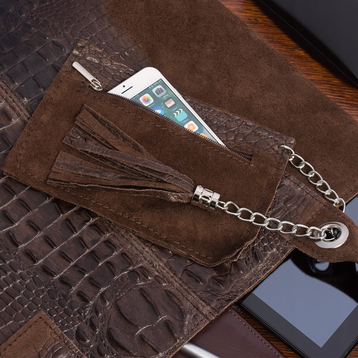 - Modną ozdobę stanowi również długi, zamszowy frędzel, będący brelokiem przy łańcuszku mocującym saszetkę wewnątrz torby