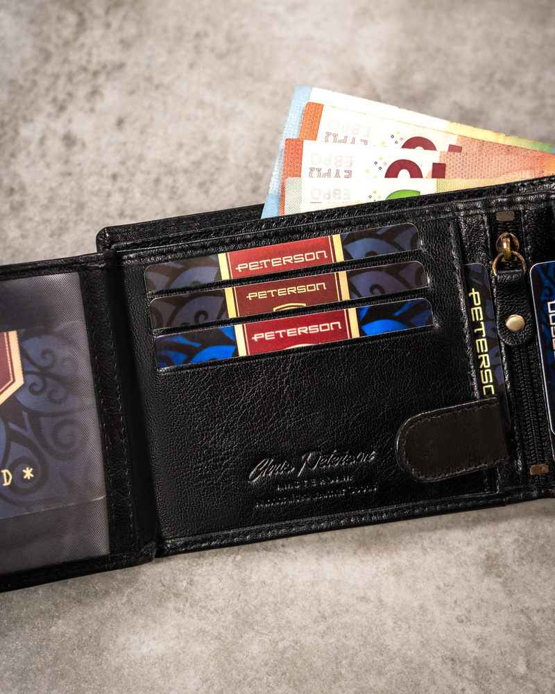 - banknoty schowasz do 2 otwartych kieszonek umiejscowionych po całej długości portfela.