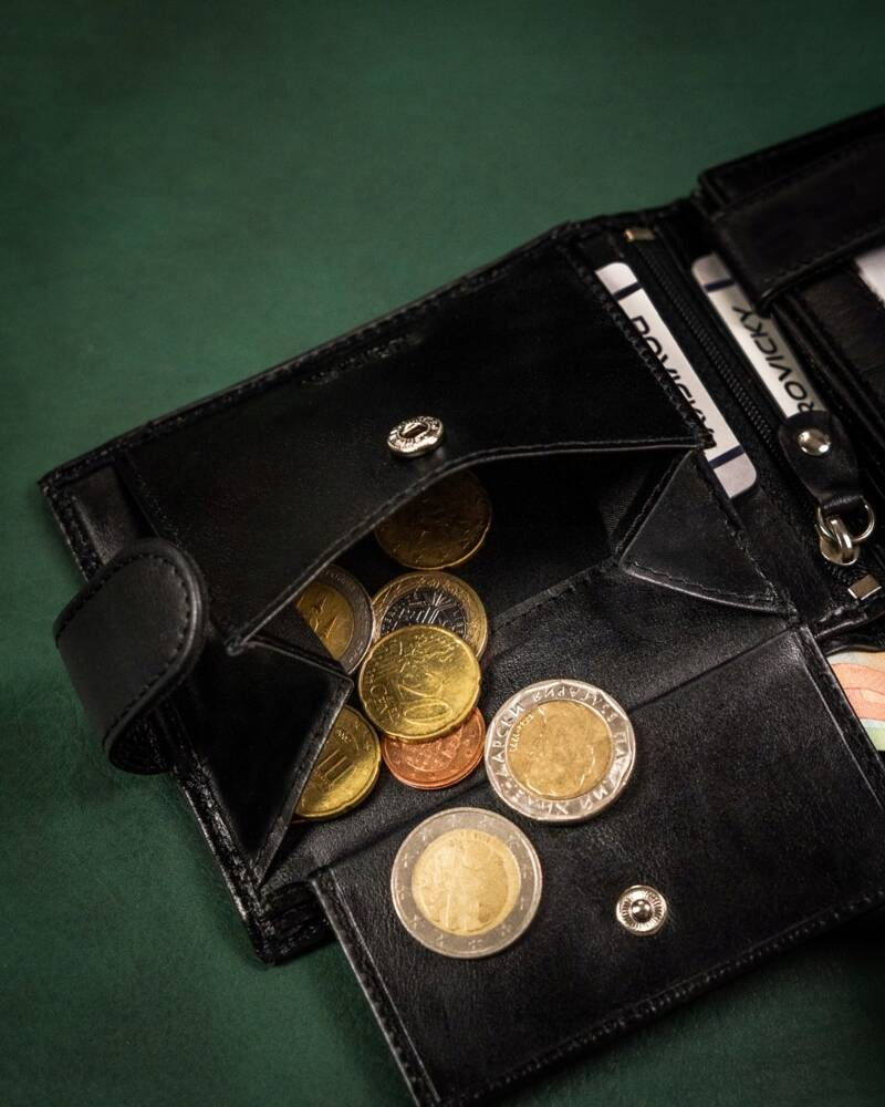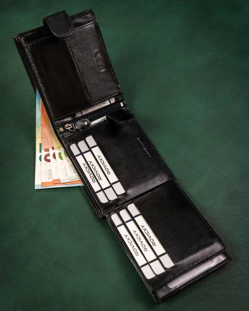- banknoty schowasz do 2 otwartych kieszonek umiejscowionych po całej długości portfela.