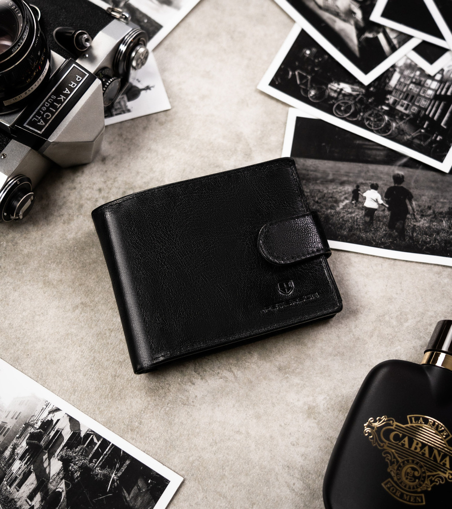 Elegancki męski portfel o ponadczasowym wyglądzie. Idealny dla mężczyzn w każdym wieku. Wykonany ze skóry naturalnej o żyłowanej teksturze i subtelnym wykończeniu. Portfel posiada na swej powierzchni tłoczenia potwierdzające, że jest skórzany i że wyposażono go w ochronę RFID.