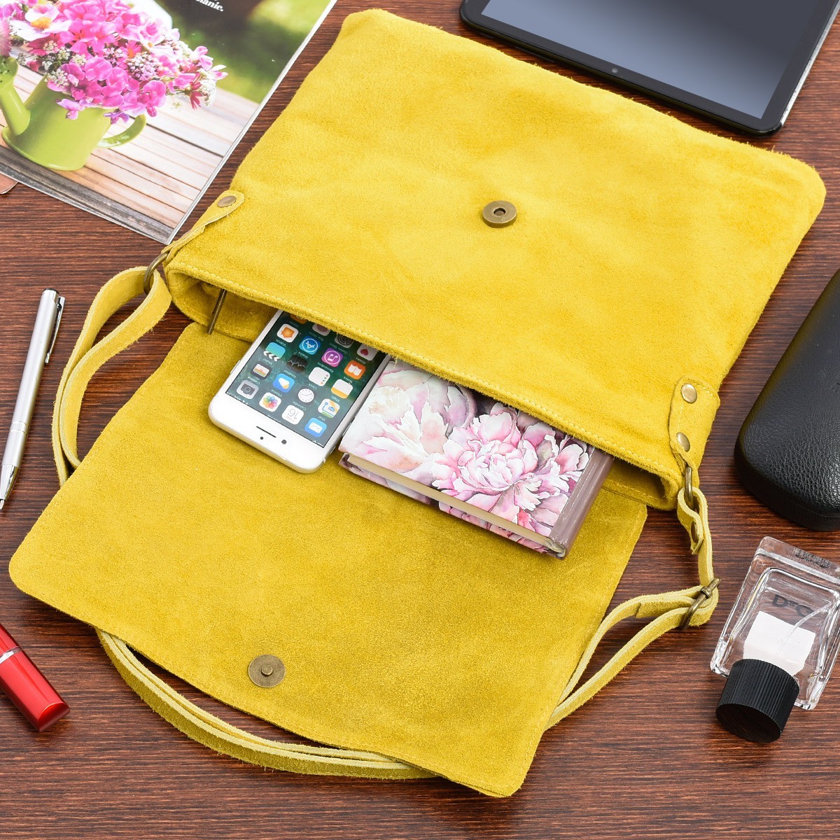f1e11f997ac37f7640e606fabb14e07aŻółta Włoska Torebka damska zamszowa listonoszka z klapą B67