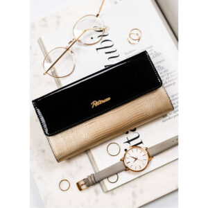 Czarno-złoty, elegancki portfel damski zamykany na zatrzask – Peterson Klasyczna konstrukcja | Wygodny w codziennym użytkowaniu portfel o poziomej orientacji i zapięciu na zatrzask; Jakościowe wykonanie | Wykonany ze skóry naturalnej o wysokiej jakości; Praktyczne wnętrze | Połączenie elegancji i funkcjonalności. Portfel zapewnia wystarczającą ilość miejsc na wszystkie najważniejsze dokumenty, karty oraz pieniądze; Ochrona przed…
