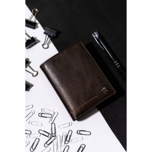 Klasyczny, skórzany portfel męski w ciemnobrązowym kolorze zamykany na zatrzask Portfel odszyty z trwałej nubukowej skóry naturalnej. Model o klasycznej stylistyce. Portfel w orientacji poziomej, zapinany na zatrzask. Posiada rozbudowane wnętrze – będzie idealnym wyborem właśnie dla Ciebie, jeżeli na co dzień nosisz dokumenty w dużym formacie jak np. dowód rejestracyjny. Ponadto zmieścisz w nim pokaźne ilości kart oraz gotówki….