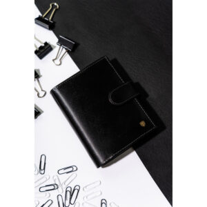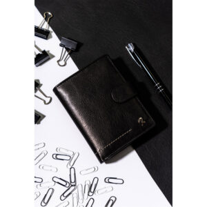 Portfel męski ze skóry naturalnej w czarnym kolorze zamykany zatrzaskiem – Rovicky Wysoka jakość wykonania | Portfel odszyty z naturalnej skóry bydlęcej licowej w zawsze modnym i klasycznym czarnym kolorze. Skórzana klasyka | Zainwestuj w portfel, z którym będziesz czuć się modnie i komfortowo. Rozbudowane wnętrze | Portfel średniej wielkości, który bez trudu zmieścisz w kieszeń spodni czy kurtki. Posiada rozbudowane…