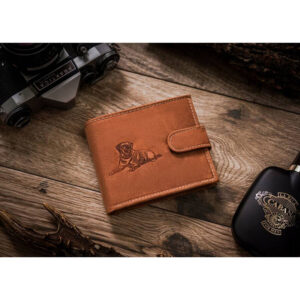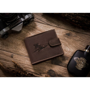 Skórzany, brązowy portfel męski z tłoczeniem na froncie przedstawiającym psa Portfel odszyty z trwałej nubukowej skóry naturalnej. Model o klasycznej stylistyce. Portfel w orientacji poziomej, zapinany na zatrzask. Posiada rozbudowane wnętrze – będzie idealnym wyborem właśnie dla Ciebie, jeżeli na co dzień nosisz dokumenty w dużym formacie jak np. dowód rejestracyjny. Ponadto zmieścisz w nim pokaźne ilości kart oraz gotówki….