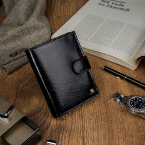 Skórzany portfel męski z zapięciem – Peterson Jakość i precyzja wykonania | Uszyty z wysokogatunkowej skóry naturalnej. Specjalna technika garbowania, niezmienna od dziesięcioleci, pozwala na pokazanie naturalności i piękna tego naturalnego surowca; Klasyczna czerń zawsze w modzie | Portfel o klasycznej stylistyce. Model w orientacji pionowej z zapięciem zewnętrznym; Rozbudowane wnętrze | Portfel będzie dla Ciebie idealny, jeżeli na co…